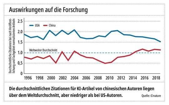 Die Zentralbank (People’s Bank of China) wacht aufmerksam über den Wechselkurs des Yuan zum Dollar. Ziel ist, dass die heimischen Firmen etwas billiger produzieren können als US-amerikanische. Doch diese Vorgabe relativiert sich zunehmend, denn der aktuelle Fünfjahresplan sieht den Umbau von einer investitions- und exportorientierten hin zu einer innovationsgetriebenen Wirtschaft vor. In zehn identifizierten Leitbranchen wie Elektromobilität, Informations- und Kommunikationstechnologien, Werkzeugmaschinenbau, Automatisierung sowie Luft- und Raumfahrttechnik strebt man die globale Technologieführerschaft an[2]. Insbesondere im Bereich der Künstlichen Intelligenz ist ein Kopf-an-Kopf-Rennen mit den USA entbrannt[3].