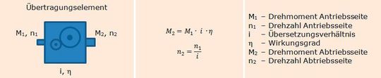 Die am Abtriebselement beziehungsweise in der Anwendung benötigte Drehzahl ist in den meisten Fällen kleiner als die vom rotativen Motor zur Verfügung gestellte. Motoren können mit wirtschaftlich vertretbarem Aufwand und auf Grund ihres elektromagnetischen Prinzips nur in bestimmten Drehzahlabstufungen hergestellt werden. Um für die Vielfalt der Drehzahlanforderungen eine optimale Anpassung vornehmen zu können, gibt es dafür verschiedenste Übertragungselemente wie beispielsweise Zahnrad-, Keil-, Flach oder Zahnriemengetriebe. Sie wandeln das vom Motor zur Verfügung gestellte Drehmoment M1 und die Drehzahl n1 auf der Antriebsseite in das Drehmoment M2 und die Drehzahl n2 auf der Abtriebsseite um.