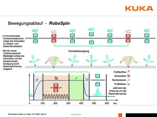 In der neuen Verfahrenstechnik Robospin sind Hauptzeit (Schweißen) und Nebenzeit (Zangenversatzbewegung) überlagert. Dabei erfolgt der Versatz zum nächsten Punkt im Wesentlichen durch Orientierungsänderung aus den Roboterhandachsen.