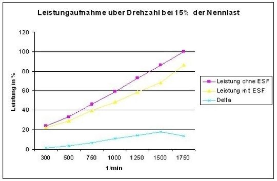 Über den Drehzahlbereich bis zur Nenndrehzahl ergibt sich wie in Bild 4 ersichtlich der Verlauf für die aufgenommene Leistung bei einer Belastung von 15% der Nennlast. Die bei 1750 min–1 aufgenommene Leistung ohne Energiesparfunktion stellt den Bezugswert dar.