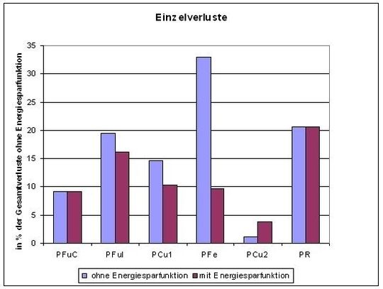 Durch die Energiesparfunktion lassen sich sowohl die Verluste des Umrichters als auch die der ASM minimieren. Dadurch wird auch die insgesamt aufgenommene Leistung reduziert. Die Darstellung in Bild 3 gibt einen Überblick über die Reduktion der Verluste im Frequenzumrichter und der ASM. Bei diesem Beispiel legen wir eine Belastung von 15% der Nennbelastung und Nenndrehzahl zugrunde.