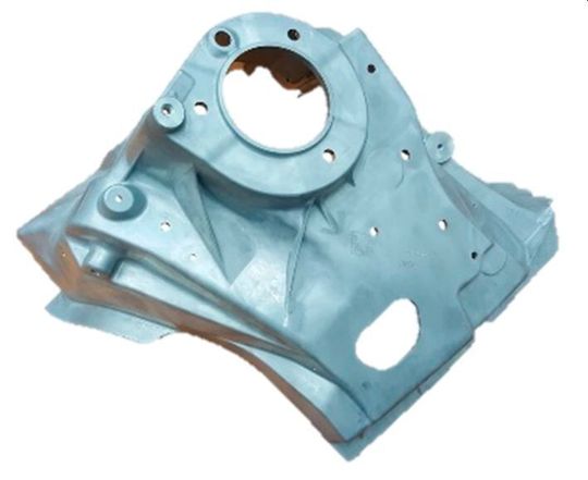 - Durch extrem hohe Lasten im Bereich der Lageraufnahme kommt es zu großen Materialanhäufungen (Wanddicken im Bereich von 30 mm), die für Spritzgießbauteile aufgrund von langen Zykluszeiten, Verzug und Lunkern nicht umsetzbar sind.