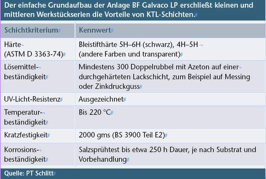 Dazu kommt der Kostenvorteil des Verfahrens. Zwar lässt sich zum Beispiel der Kostenunterschied zu einer galvanischen Beschichtung schwer beziffern, doch kann man von einer Faustregel ausgehen: Eine KTL-Tauchlackierung ist im Vergleich zu einer galvanischen Behandlung (Gestellware) etwa um den Faktor 2,5 bis 3 kostengünstiger.