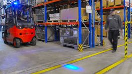 Die Lösung der Linde-Ingenieure: eine blaue LED-Lampe, die am Stapler befestigt wird und in Fahrtrichtung ein Warnsignal auf dem Boden markiert. Eine Lösung, die sich entweder ab Werk bestellen oder unkompliziert nachrüsten lässt und bei geringen Investitionskosten ein deutliches Plus an Sicherheit verspricht.