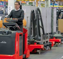 Die Logistikzüge von Linde Material Handling sind die ideale Transportlösung für den Materialfluss in der getakteten Produktion.