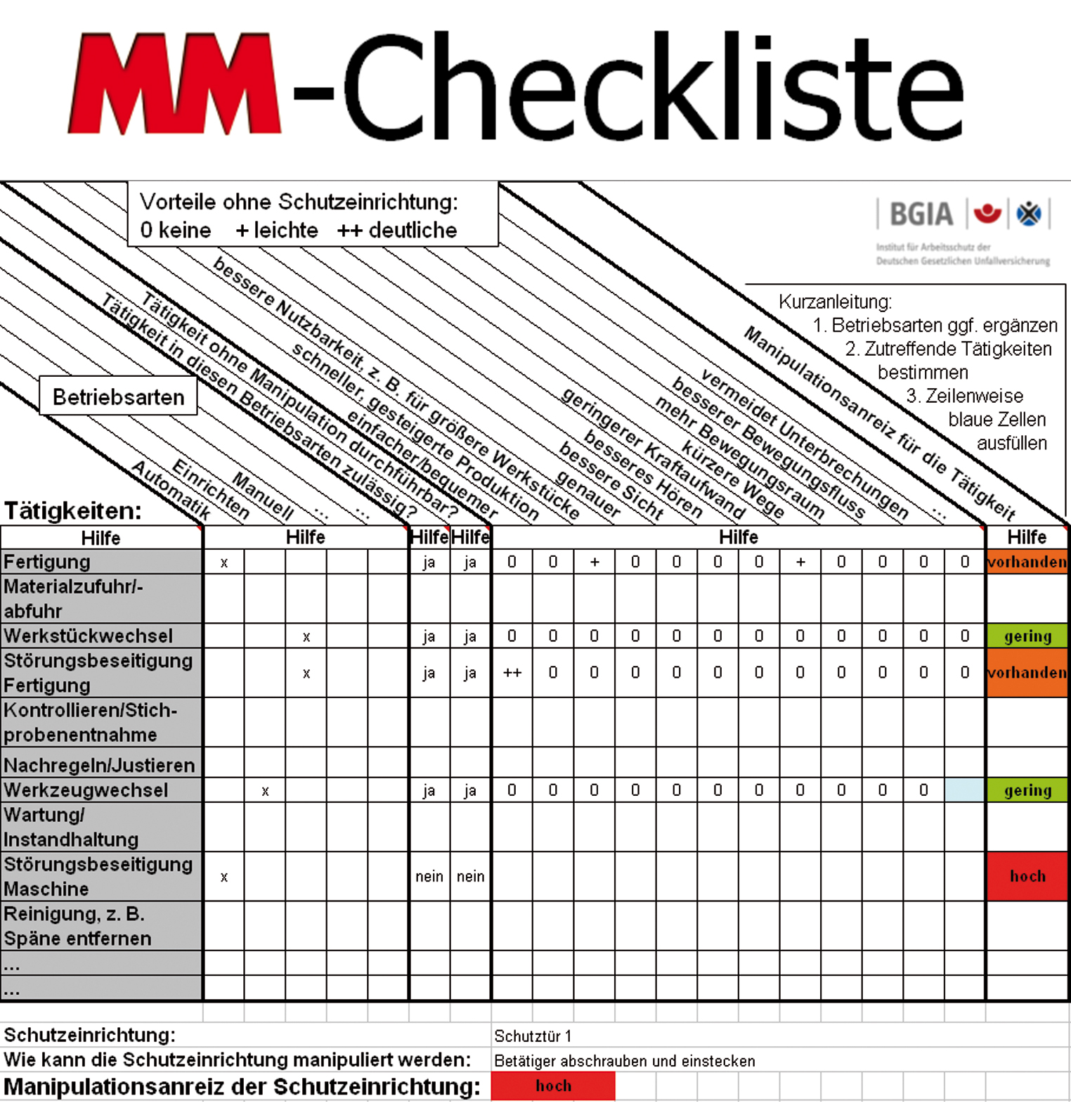 Man stellt dazu einem Bediener die Frage, welchen Nutzen die Manipulation einer Schutzeinrichtung hätte. Eine Checkliste zur systematischen Analyse des Manipulationsanreizes zeigt die Tabelle, die individuell ergänzt werden kann [2].
