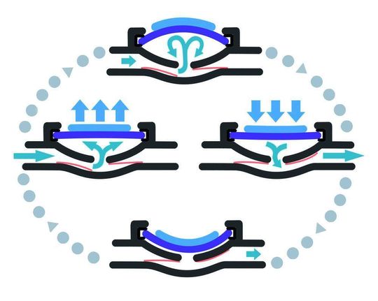 Kern der Pumpen sind Piezoaktoren, deren Verformung beim Variieren der angelegten Spannung eine Membran auf und ab bewegt. Unter der Membran befindet sich die Pumpkammer, aus der Flüssigkeiten oder Gase beim Senken der Membran herausgedrückt werden und die sich beim Hub der Membran erneut füllt. Passive Ventile an beiden Seiten der Pumpkammer geben die Flussrichtung vor (Bild 4). Die zwei Aktoren werden phasenverschoben angesteuert, wodurch sich der Druck der Pumpe verdoppelt.