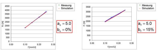 Die Modellierung des Umformanteils ist bei der Vorschubkraft noch wesentlich wichtiger als bei der Schnittkraft. Mit den weiteren Faktoren (Steigungskorrektur, Umformanteil) kann im Modell der Einfluss der Schnittgeschwindigkeit und ein zusätzlicher Umformanteil mitberücksichtigt werden (Bild 7). Dabei wird der Umformanteil aus der Zugfestigkeit Rm des zu bearbeitenden Werkstoffs abgeleitet.