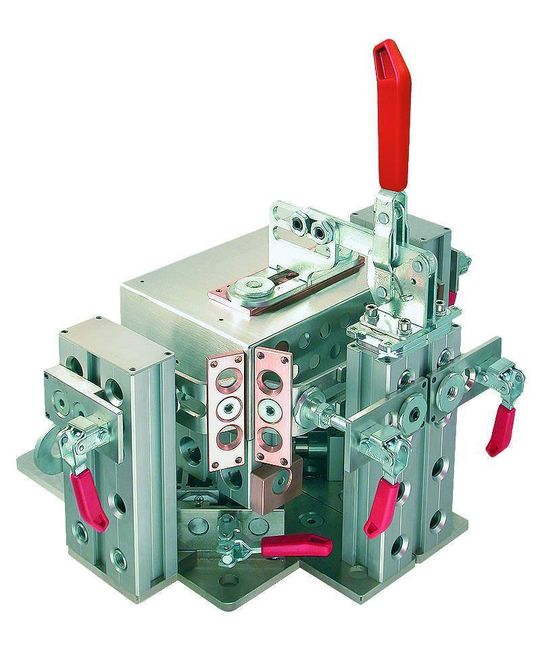 Förster: Unser Spann- und Vorrichtungssystem zum automatisierten Schweißen ist eine komplette Neuentwicklung. Dieses System besteht aus einem umfangreichen Sortiment an Systemelementen, die die Vorteile von T-Nutprofilsystemen und die in der Schweißtechnik etablierten Lochrastersysteme verbindet. Ziel ist es, einfache Vorrichtungen zum Spannen von Blechteilen kostengünstig und flexibel herzustellen.