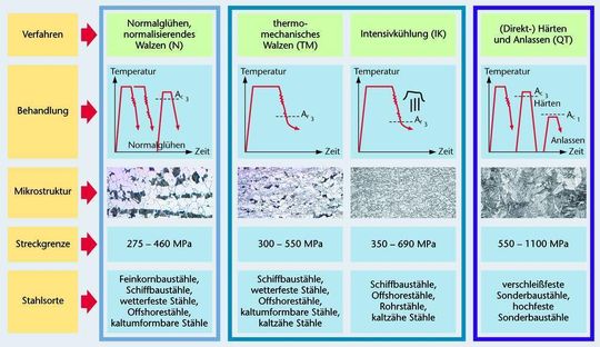 So lassen sich heutzutage durch thermomechanisches Walzen Stähle mit einer Mindeststreckgrenze von 500 MPa in großen Dicken herstellen [3 und 4]. In Kombination mit einer Anlassbehandlung im unteren Abmessungsbereich ist sogar die Herstellung noch höherfesterer Güten möglich.