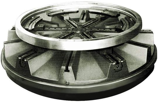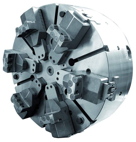 Für die Großserienfertigung von gleichen oder ähnlichen Teilen kann sich ein Sonderspannzeug lohnen. Vor allem für dünnwandige Ringe haben sich kraftbetätigte Hebelausgleichsfutter mit sechs oder mit zwölf Backen in Größen von 400 bis zu 4000 mm Durchmesser bewährt (Bild 7).