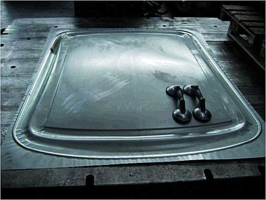 In parallelen Versuchen wurden die Möglichkeiten der Gasumformung für die Fertigung einer realen Dachgeometrie untersucht (Bild 3). Hierzu wurde ein bestehendes Werkzeug für das hydromechanische Tiefziehen an die Bedürfnisse der Gasumformung angepasst. Die Druckerzeugung erfolgte über einen Kompressor mit nachgeschaltetem Windkessel. Analog zu den oben erarbeiteten Ergebnissen konnte auch hier kein signifikanter Unterschied zwischen einem hydro- und einem gasgeformten Bauteil ermittelt werden.